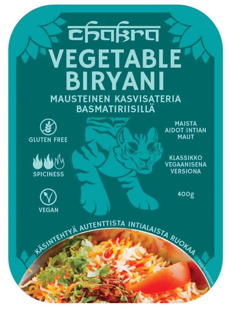 Basmatiriisi (32,5%), porkkana (14%), kukkakaali (10%), kesäkurpitsa (8%), vihreitä papuja (5%), herneitä (5%), sipuli (4%) tomaatti (2%), valkosipuli, rapsiöljy, mausteet: chilijauhe, korianteri, kumina, kurkuma, minttu, inkivääri, sarviapila, suola. Saattaa sisältää pieniä määriä pähkinää.